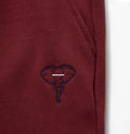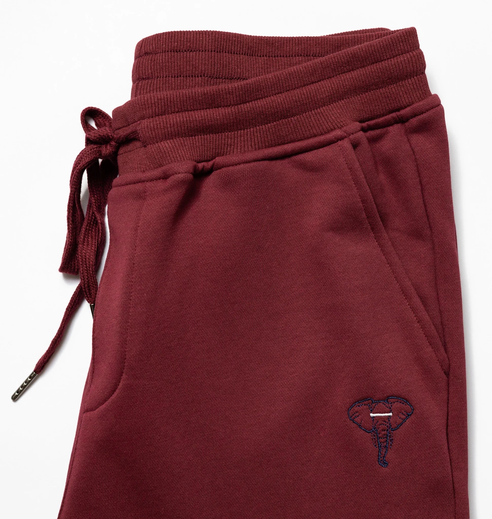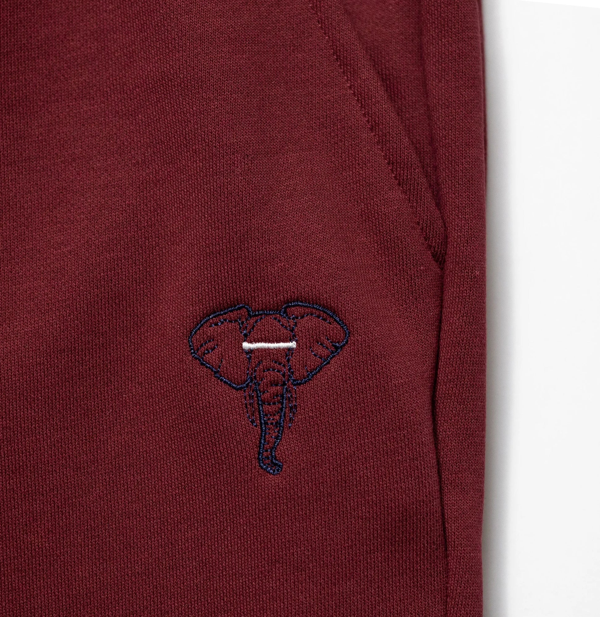 Features elastic waistband, adjustable drawstring, and embroidered elephant detail.